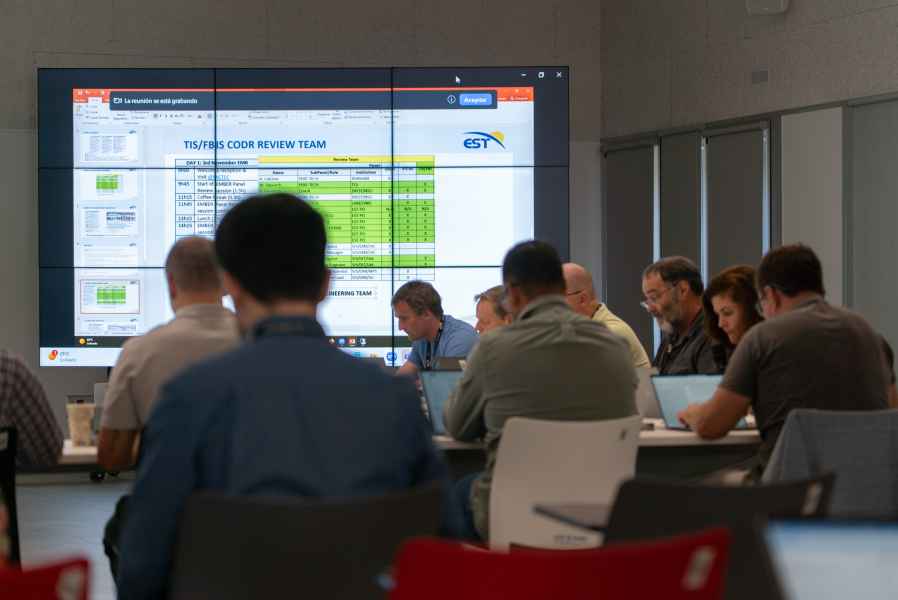 The review panel, chaired by Bret Goodrich of the National Solar Observatory (DKIST/NSO), was composed of Kjetil Dohlen from the Laboratoire d'Astrophysique de Marseille (LAM/CNRS), Ariadna Calcines from Durham University, Michael Sigwarth from the Thüringer Landessternwarte Tautenburg (TLS), André Fehlmann from DKIST/NSO, and the leaders of the different engineering areas at EST: Álvaro Pérez, from Optical Engineering; Ángel Mato and Juan Cózar, from Mechanical Engineering; Jorge Quintero, from Control Engineering; Miguel Núñez, from Systems Engineering; and Claudia Ruiz de Galarreta, from Instrument Systems Engineering.