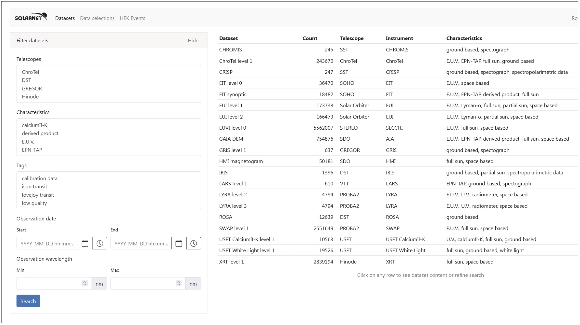 The Solarnet Virtual Observatory web interface, accessible at https://solarnet.oma.be upon registration.