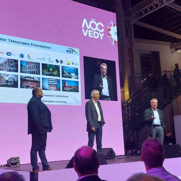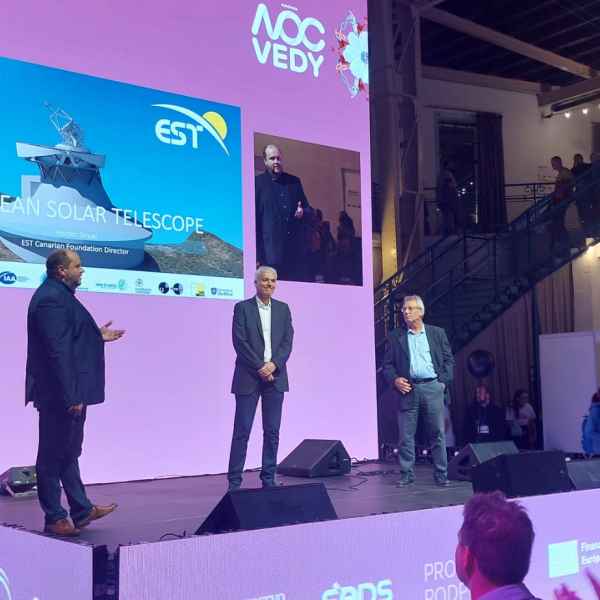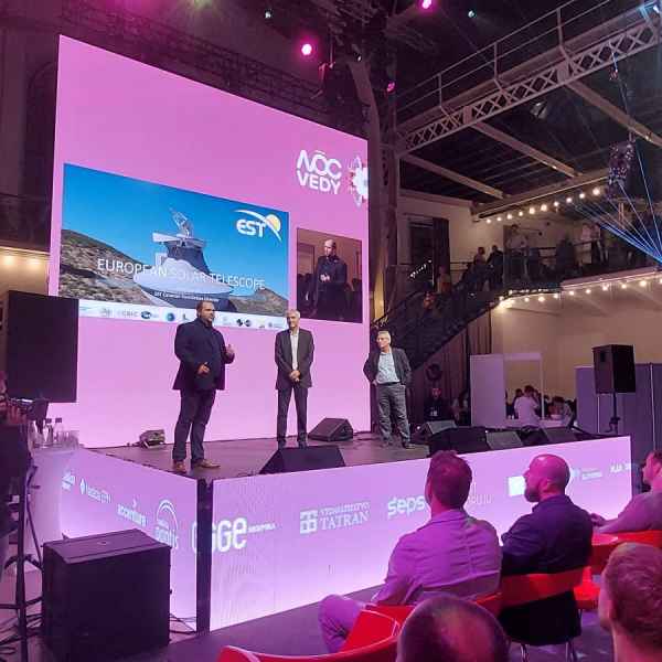 Representing the EST project were Manuel Collados (President of the Foundation), Peter Gömory (Vice President), Héctor Socas (Director), Ana Aricha (Deputy Director for Consortia, Organisations, and International Scientific Infrastructures at the Ministry of Science, Innovation and Universities), and the State Secretary of Slovakia's Ministry of Science. In addition, Manuel Collados and Peter Gömory had the opportunity to present the European Solar Telescope to the attending public, showcasing its current state of development and future projection.